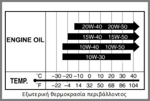 Πίνακας επιλογής λιπαντικού κινητήρα με βάση την εξωτερική θερμοκρασία περιβάλλοντος.
