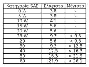 • Κατηγορίες Θερινών Λαδιών (χωρίς “W”): Οι κατηγορίες 20, 30, 40, 50 και 60 παρουσιάζουν ελάχιστο και μέγιστο ιξώδες π.χ. το 20 έχει ελάχιστο ιξώδες 5,6 cSt και μέγιστο <9,3 cSt.